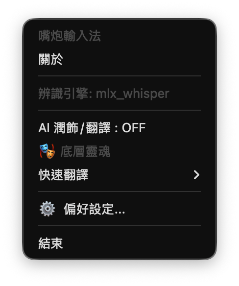 • 免費版: 打包成DMG直接下載,拖入左邊的應用程式,再依照安裝說明或是我提供的影片來繞過Apple的限制就可以使用,有語音辨識STT,也有底層靈魂可以設定,與咖啡版差別在於沒有多個靈魂可以選擇注入